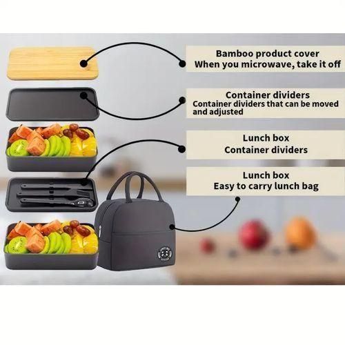 About this itemCompact Design: This lunch box features a stackable two-layer design with independent compartments to separate food and keep it freshDurable Construction: Made of food-grade, BPA-free polypropylene plastic to ensure safety and durabilityConvenient Accessories: This lunch box set includes a set of cutlery for your daily commute or travelMicrowave and Dishwasher Safe: The plastic container can be heated in the microwave and is also dishwasher safe for easy cleaning (remove the wooden lid)Adjustable Dividers: With removable dividers, you can customize the compartment size according to your dining needs